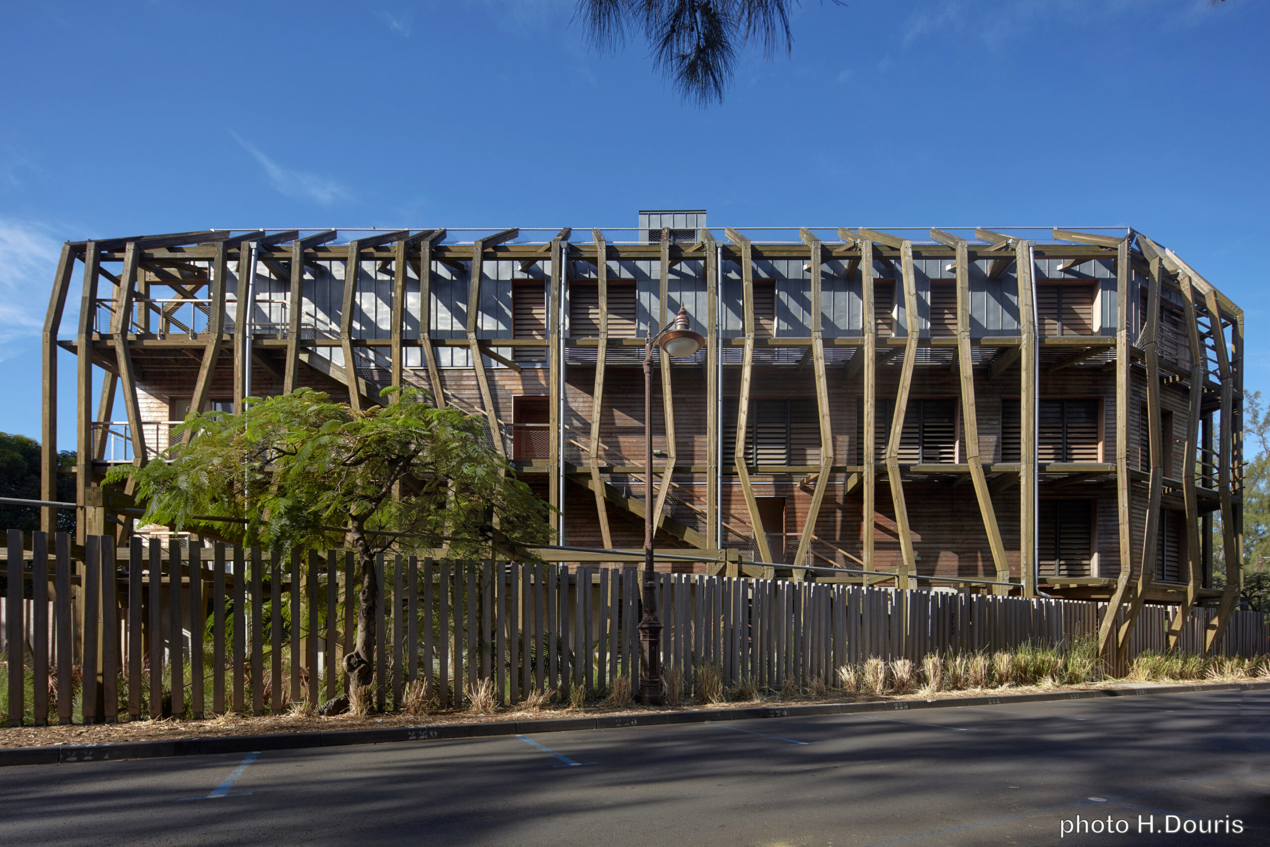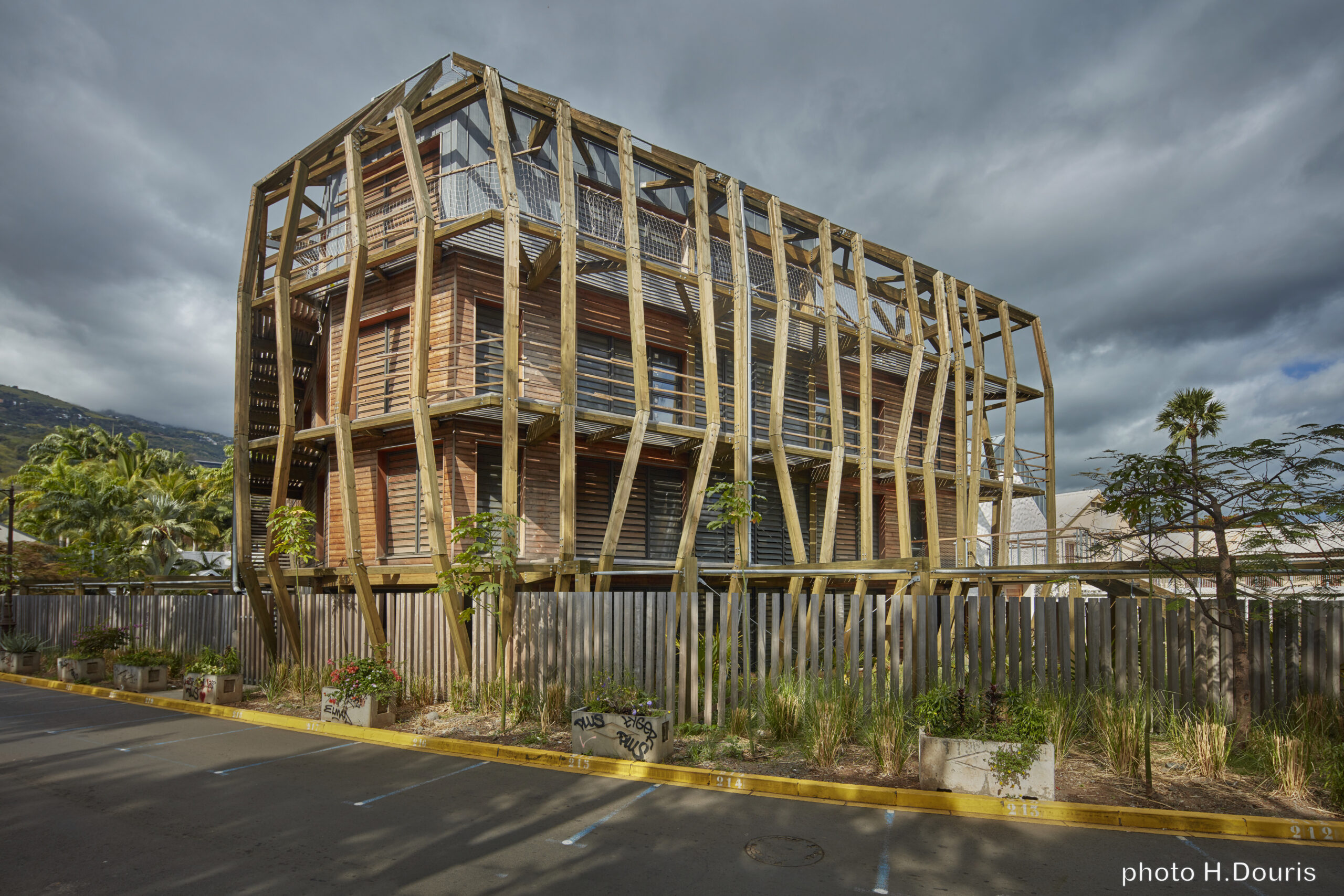 La médiathèque de Saint-Leu, inaugurée en 2019, est une réalisation marquante alliant culture et respect de l'environnement. Située sur la côte ouest de La Réunion, elle relie le centre historique de la ville à son front de mer, créant un axe piétonnier et ombragé qui devient un espace de vie pour les habitants.