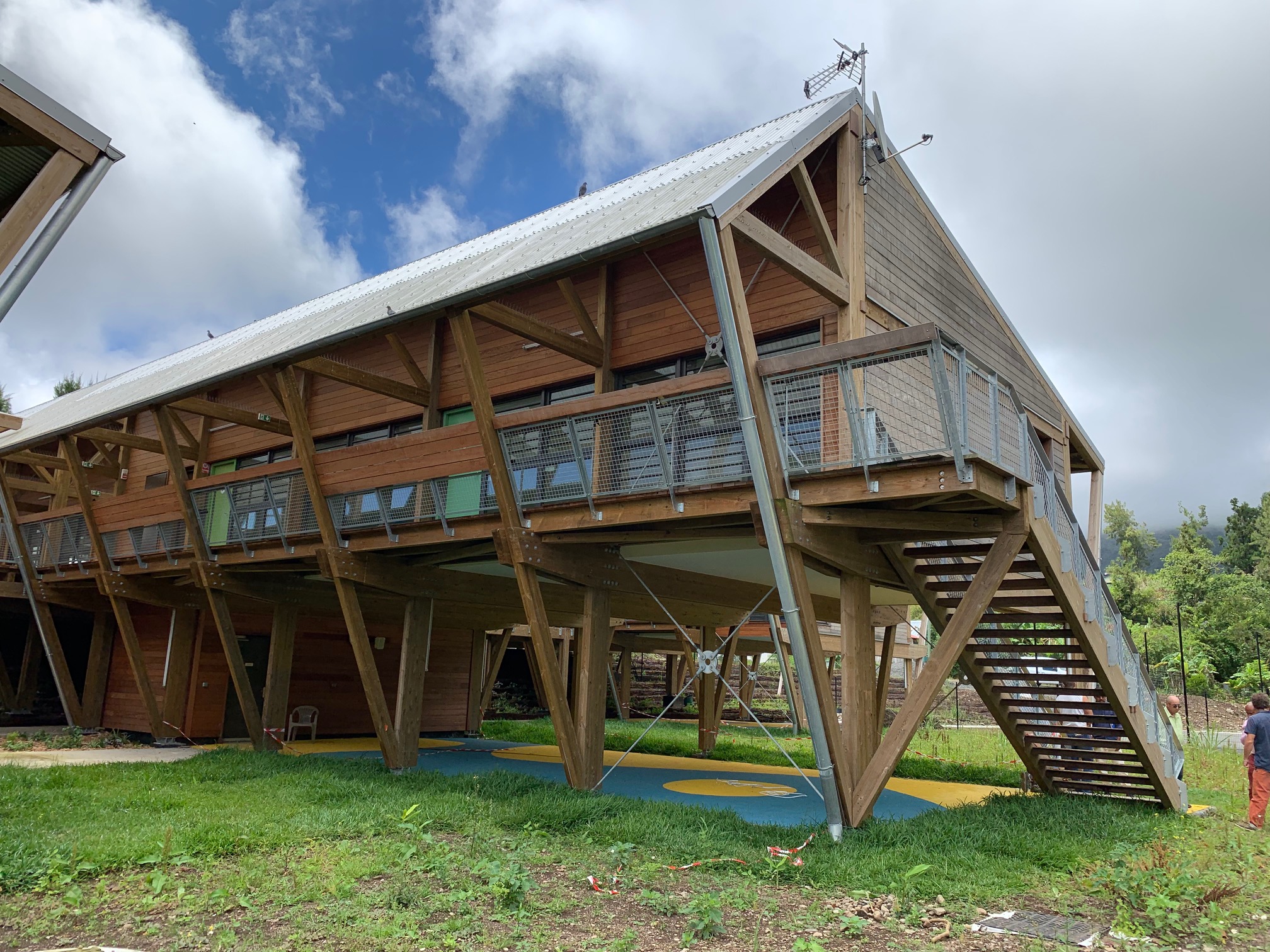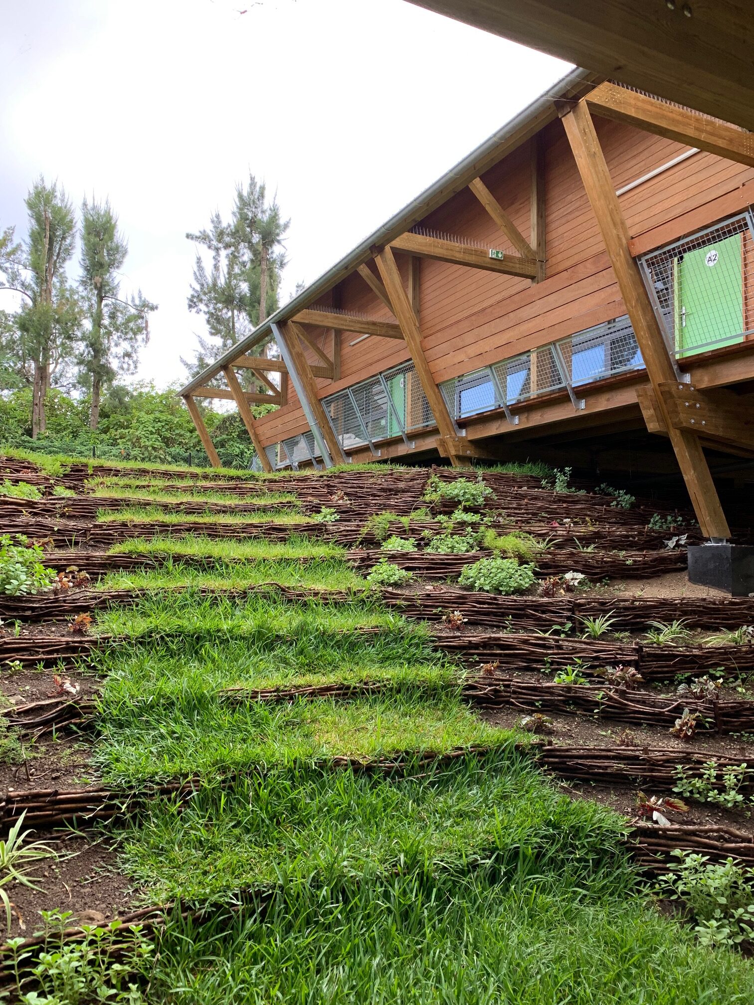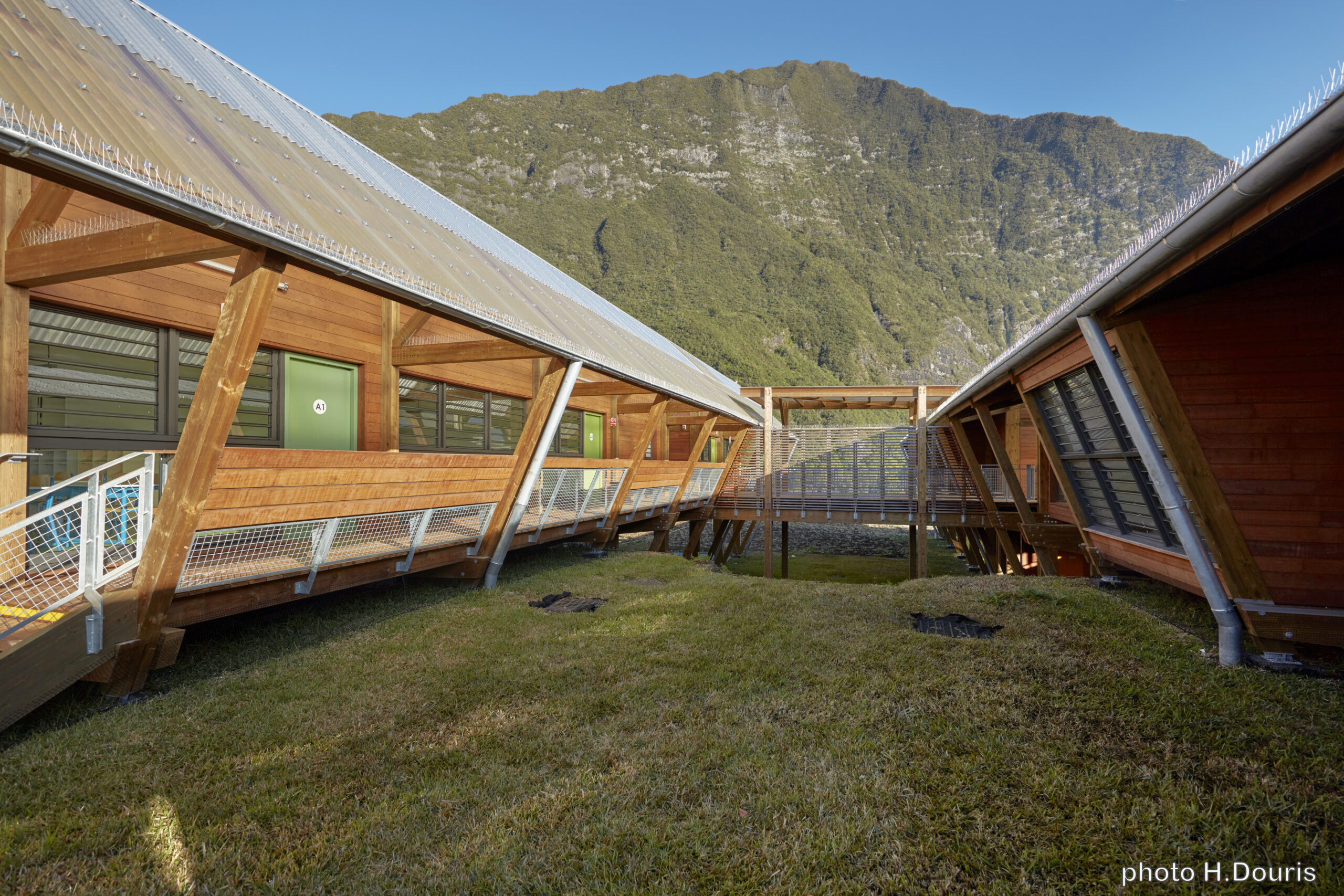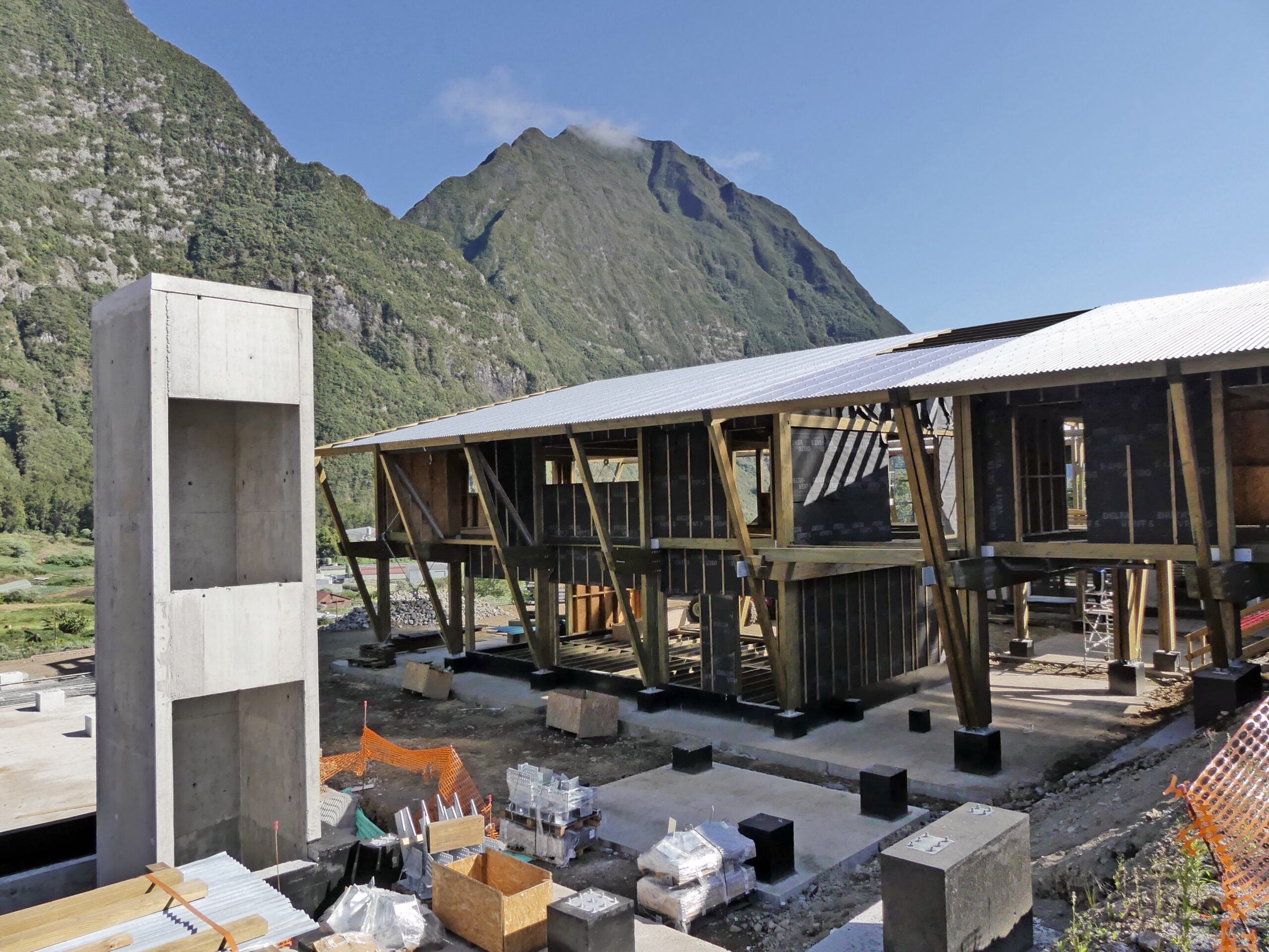 L’usage du bois, de la pierre et de matériaux naturels légers rend le bâtiment économe et facile à entretenir, tout en renforçant la lisibilité des volumes et la cohérence avec le paysage réunionnais.