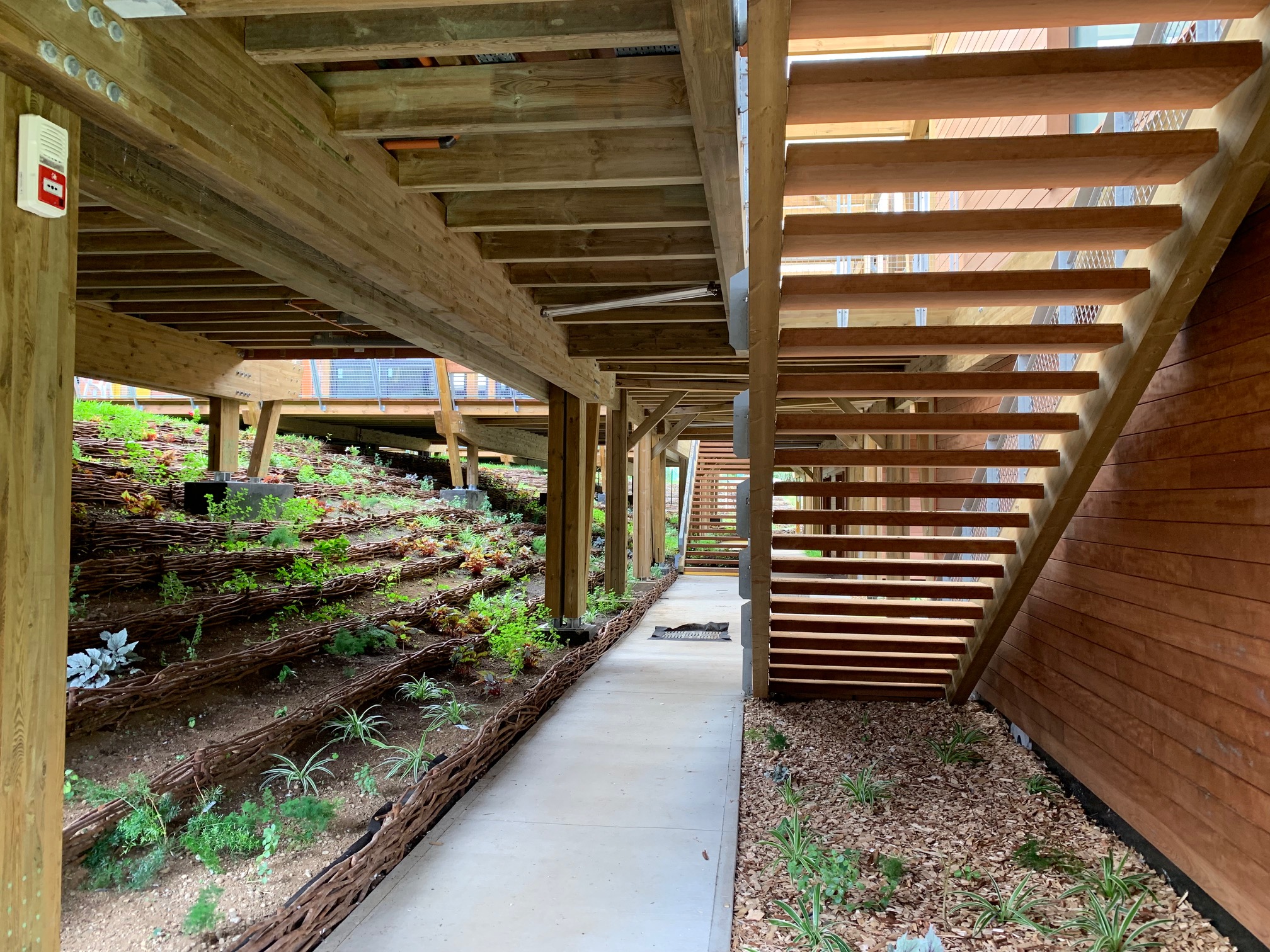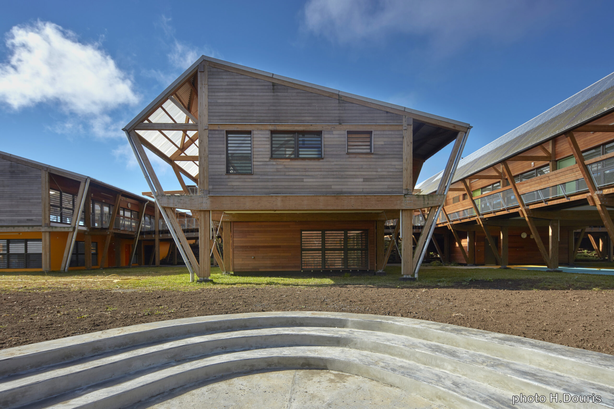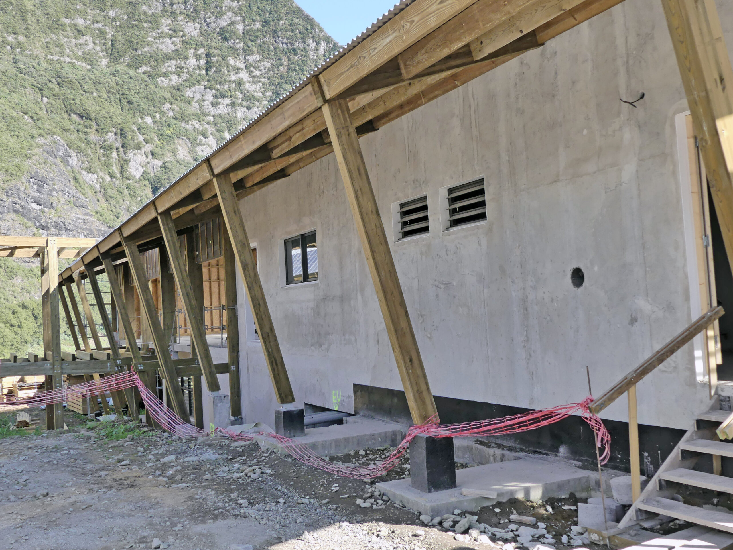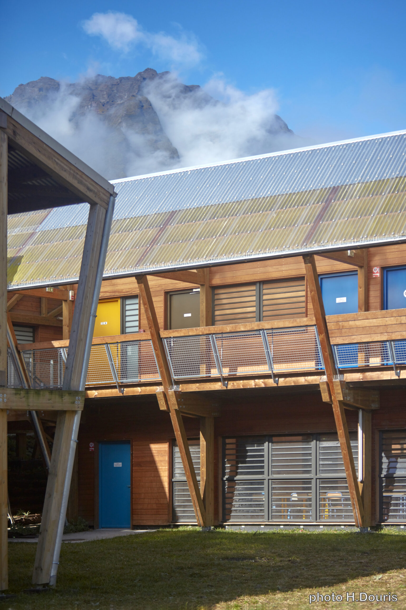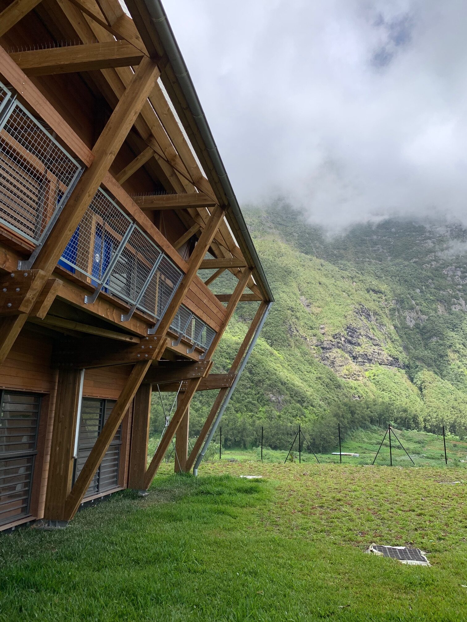L’usage du bois, de la pierre et de matériaux naturels légers rend le bâtiment économe et facile à entretenir, tout en renforçant la lisibilité des volumes et la cohérence avec le paysage réunionnais.