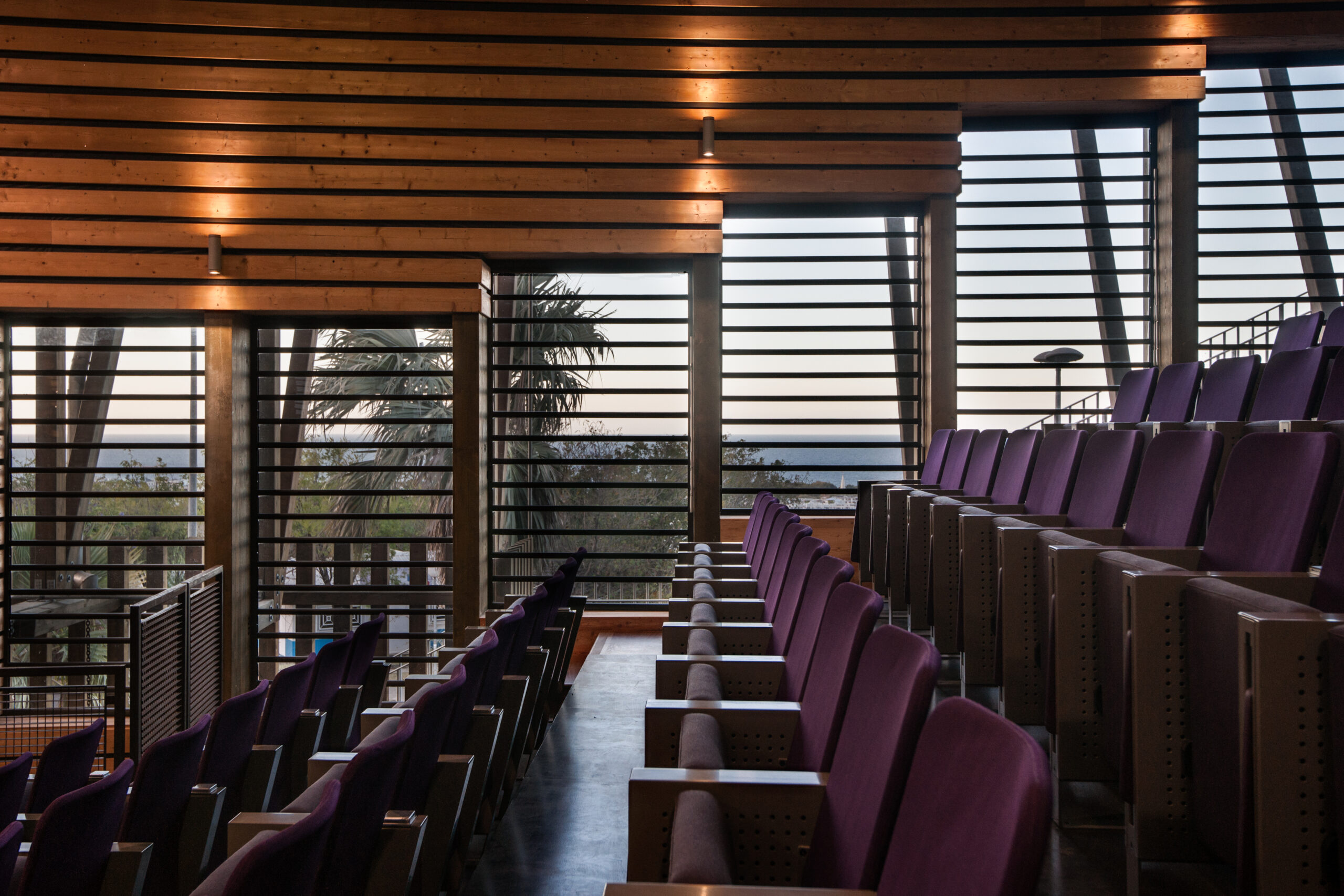 La particularité de cet auditorium réside dans sa capacité à assurer un confort thermique optimal sans recourir à la climatisation. La ventilation naturelle repose sur plusieurs dispositifs ingénieux : un puits de faîtage pour évacuer l’air chaud, des ouïes réglables pour diriger l'air frais, et un sol perméable sous les gradins pour favoriser la circulation de l'air. Ces systèmes permettent de réduire la température ressentie de 4°C, même pendant les périodes de forte chaleur.