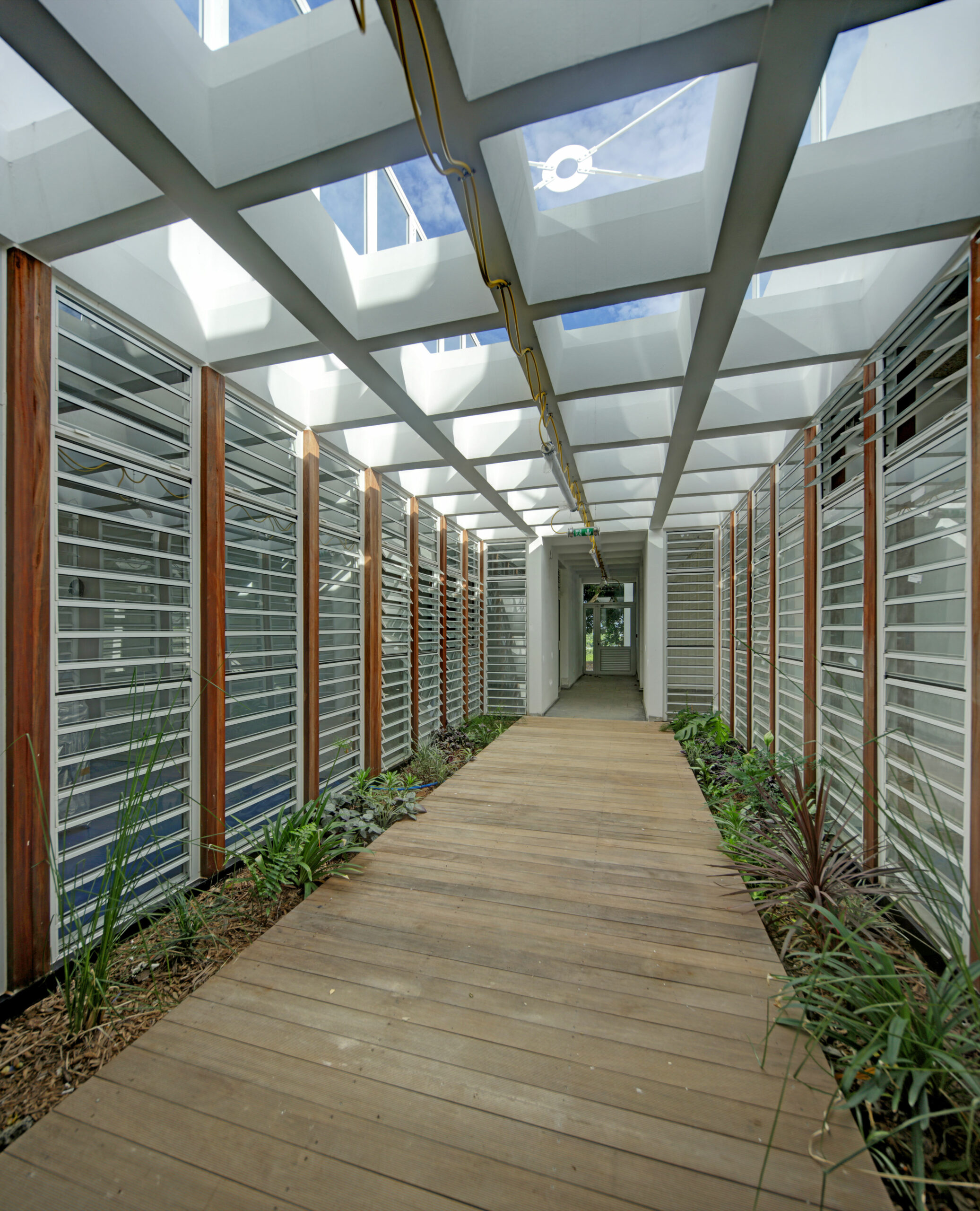 L’installation d’écopes, patios dépressionnaires et trappes permet d’assurer une ventilation naturelle efficace dans tous les locaux, tout en respectant les contraintes acoustiques des salles d’enseignement.