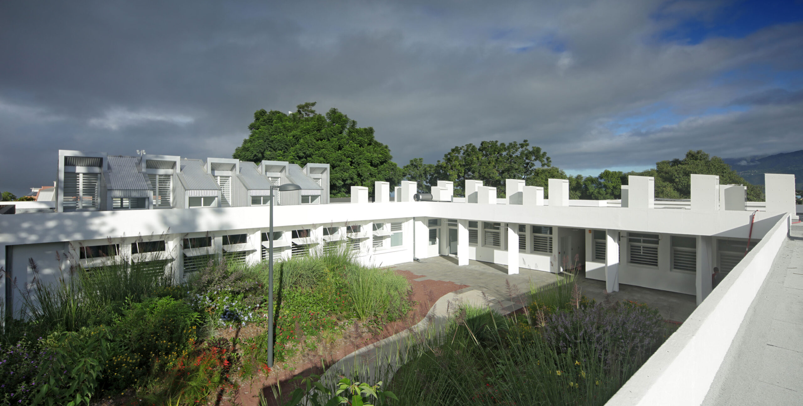 Le bâtiment « M » du campus universitaire du Tampon, construit dans les années 1970, a subi une réhabilitation complète pour répondre aux nouvelles exigences climatiques tout en préservant son architecture originale.