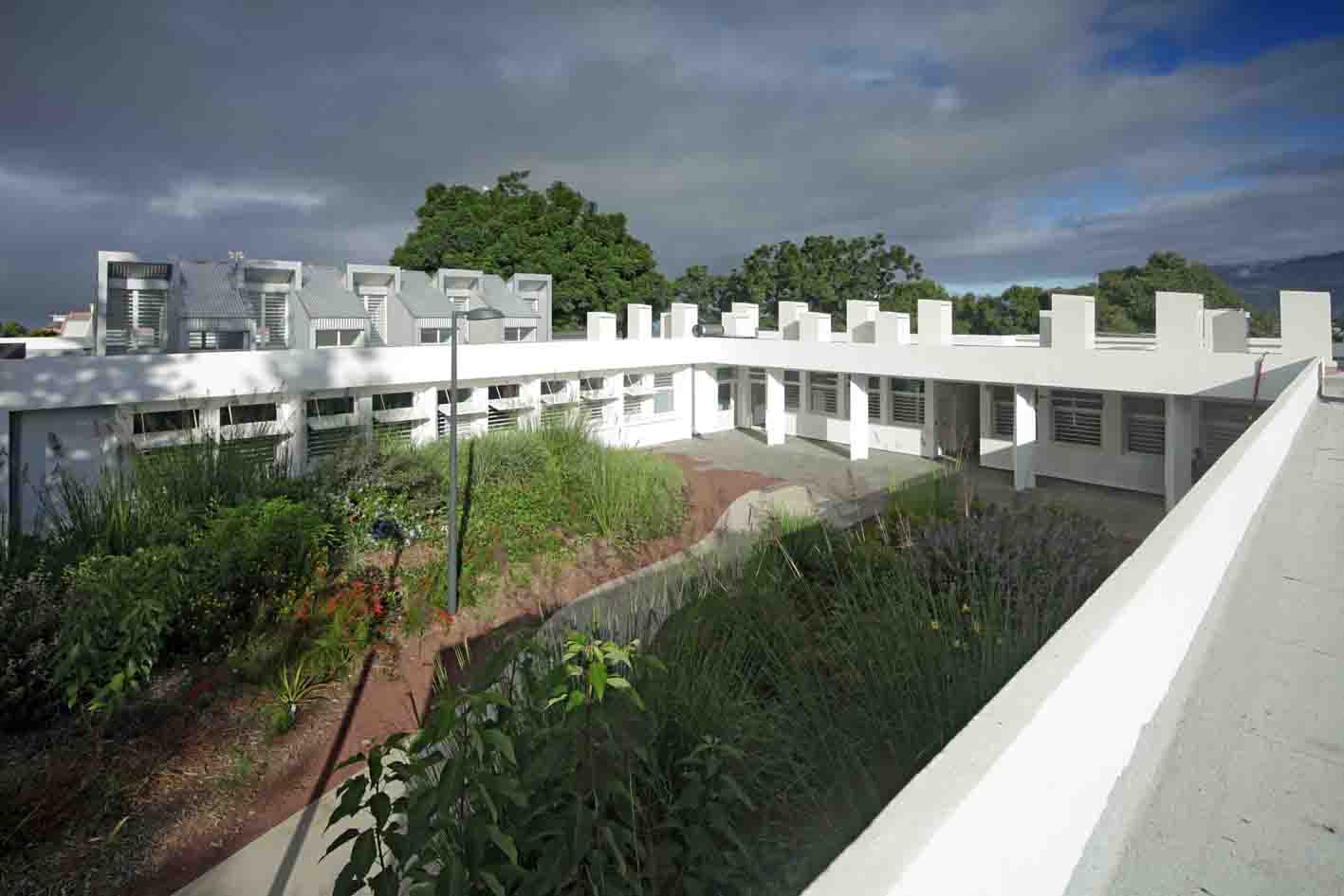 Le projet du Bâtiment M repose sur des principes bioclimatiques et durables qui exploitent les conditions naturelles de La Réunion pour limiter l’usage des systèmes énergétiques. La ventilation naturelle, combinée à l’optimisation de l’isolation et des protections solaires, réduit la consommation énergétique globale. Ce bâtiment réhabilité démontre comment la réutilisation intelligente d’un bâti existant peut répondre aux enjeux environnementaux modernes tout en assurant le confort des usagers.